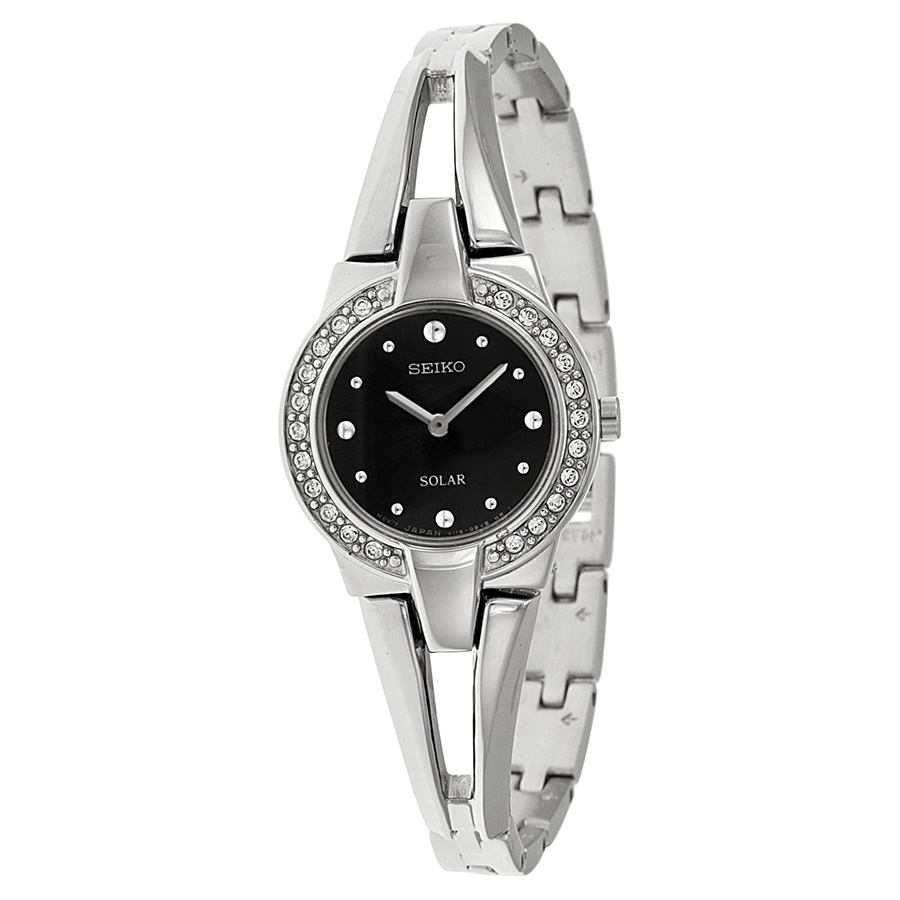 Stainless steel case with a stainless steel bangle bracelet. Fixed stainless steel bezel set with Swarovski crystals. Black dial with silver-tone hands and dot hour markers. Dial Type: Analog. Solar quartz movement. Scratch resistant Hardlex crystal. Pull / push crown. Solid case back. Case diameter: 21 mm. Case thickness: 7 mm. Round case shape. Band width: 8 mm. Jewelry clasp. Water resistant at 30 meters / 100 feet. Functions: hour, minute. Casual watch style. Seiko Solar Black Dial Stainless Steel Ladies Watch SUP205.