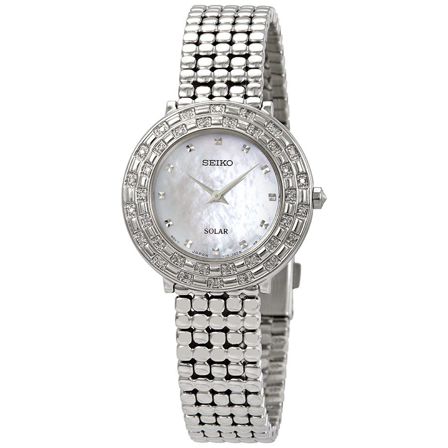 Stainless steel case with a stainless steel bracelet. Fixed stainless steel bezel set with crystals. White mother of pearl dial with silver-tone hands and index hour markers. Dial Type: Analog. Seiko caliber V115 quartz movement. Scratch resistant Hardlex crystal. Pull / push crown. Solid case back. Round case shape. Case size: 29 mm. Case thickness: 7 mm. Band width: 13 mm. Fold over clasp with a safety release. Water resistant at 30 meters / 100 feet. Functions: hour, minute, solar-powered. Additional Info: 36 diamonds. Dress watch style. Watch label: Japan Movt. Seiko Tressia Solar Crystal White Mother of Pearl Dial Ladies Watch SUP373.