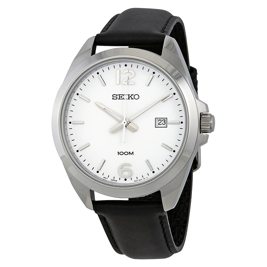 Stainless steel case with a black leather strap. Fixed stainless steel bezel. White dial with luminous silver-tone hands and index hour markers. Arabic numerals mark the 6 and 12 o'clock positions. Minute markers around the outer rim. Dial Type: Analog. Luminescent hands and markers. Date display at the 3 o'clock position. Quartz movement. Scratch resistant Hardlex crystal. Pull / push crown. Solid case back. Round case shape. Case size: 42 mm. Case thickness: 9.5 mm. Band width: 20 mm. Tang clasp. Water resistant at 100 meters / 330 feet. Functions: date, hour, minute, second. Casual watch style. Seiko Neo Classic White Dial BlackLeather Mens Watch SUR213.