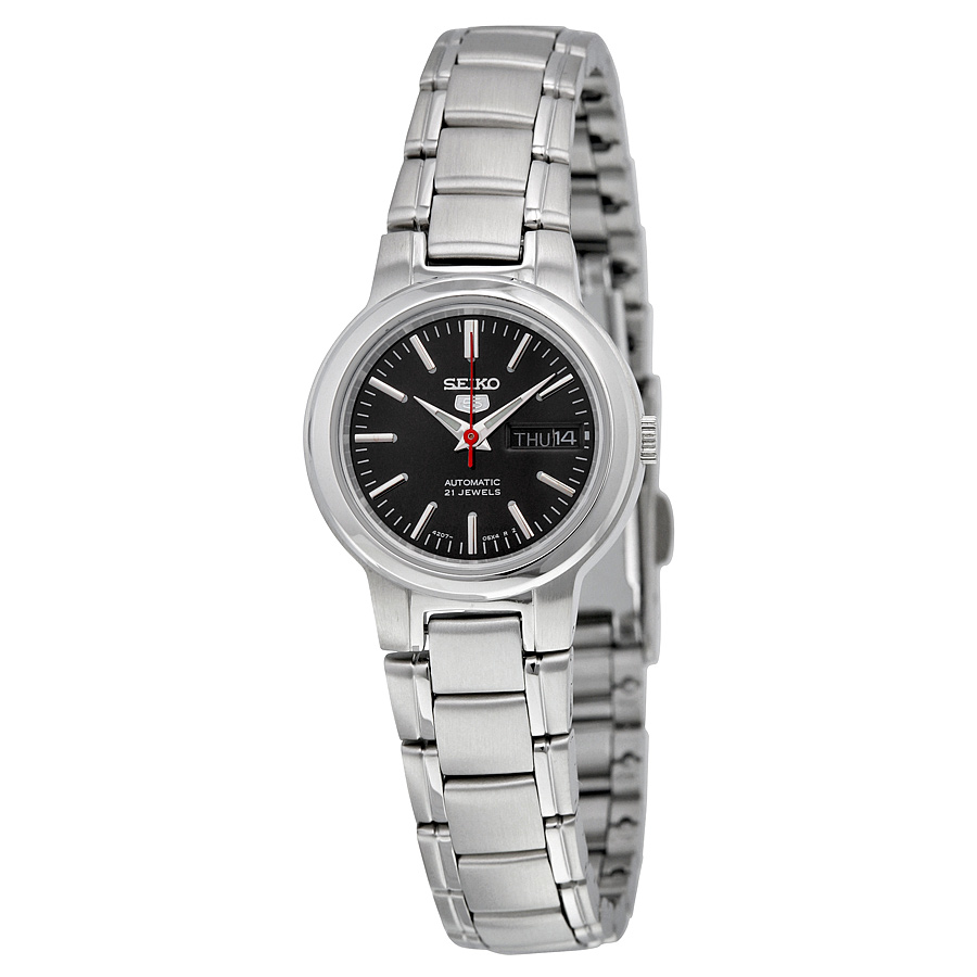 Stainless steel case with a stainless steel bracelet. Fixed stainless steel bezel. Black dial with luminous silver-tone hands and index hour markers. Minute markers around the outer rim. Dial Type: Analog. Luminescent hands and markers. Day of the week and date display at the 3 o'clock position. Seiko caliber 4207 automatic movement, containing 21 Jewels, bitting at 21600 vph, and has a power reserve of approximately 24 hours. Scratch resistant Hardlex crystal. Pull / push crown. Solid case back. Round case shape. Case size: 25 mm. Case thickness: 10 mm. Band width: 14 mm. Deployment clasp. Water resistant at 30 meters / 100 feet. Functions: date, day, hour, minute, second. Additional Info: withstands rain and splashes of water, but not showering or submersion. Casual watch style. Seiko Series 5 Automatic Black Dial Ladies Watch SYME43.