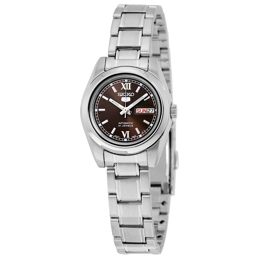 Stainless steel case with a stainless steel bracelet. Fixed stainless steel bezel. Brown dial with luminous silver-tone hands and index hour markers. Roman numerals mark the 6 and 12 o'clock positions. minute markers around the outer rim. Dial Type: Analog. Luminescent hands and markers. Day of the week and date display at the 3 o'clock position. Automatic movement. Scratch resistant Hardlex crystal. Pull / push crown. Solid case back. Case diameter: 24 mm. Case thickness: 10 mm. Round case shape. Band width: 10 mm. Fold over clasp. Water resistant at 30 meters / 100 feet. Functions: date, day, hour, minute, second. Additional Info: day/date display with spanish option. Casual watch style. Seiko 5 Automatic Brown Dial Stainless Steel Ladies Watch SYMK25.