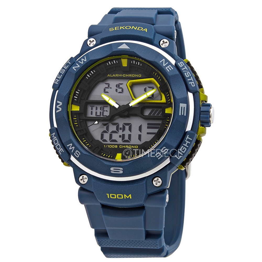Blue plastic case with a blue rubber strap. Blue plastic bezel. Analog / digital dial with kluminous green hands and index hour markers. Dial Type: Analog-digital. Quartz movement. Scratch resistant mineral crystal. Solid case back. Round case shape. Case size: 53 mm. Case thickness: 19 mm. Band width: 25 mm. Tang clasp. Water resistant at 100 meters / 330 feet. Functions: chronograph, date, hour, minute, second, alarm. Sport watch style. Sekonda Alarm Chronograph Quartz Analog-Digital Mens Watch 1162.05.