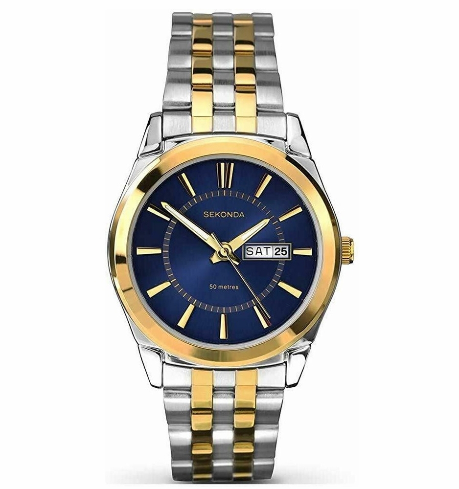Stainless steel case with a two-tone (silver-tone and gold-tone) stainless steel bracelet. Fixed gold-tone bezel. Blue dial with luminous gold-tone hands and index hour markers. Minute markers around an inner ring. Dial Type: Analog. Luminescent hands. Day of the week and date display at the 3 o'clock position. Quartz movement. Scratch resistant mineral crystal. Pull / push crown. Solid case back. Round case shape. Case size: 38 mm. Case thickness: 9 mm. Band width: 18 mm. Fold over clasp with a safety release. Water resistant at 50 meters / 165 feet. Functions: date, day, hour, minute, second. Casual watch style. Sekonda Quartz Blue Dial Two-tone Mens Watch 1032.28.