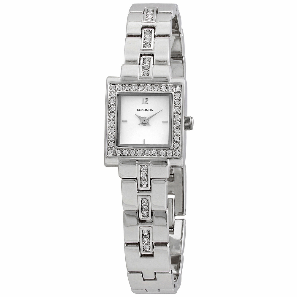 Silver-tone alloy case with a silver-tone alloy bracelet with crystal-set links. Fixed silver-tone alloy bezel set with crystals. Silver dial with silver-tone hands. An Arabic numeral appears at the 12 o'clock position. Index markers appear at the 3, 6 and 9 o'clock positions. Dial Type: Analog. Quartz movement. Scratch resistant mineral crystal. Pull / push crown. Solid case back. Square case shape. Case size: 19 mm. Jewelry clasp. Water resistant at 50 meters / 165 feet. Functions: hour, minute. Dress watch style. Watch label: Japan Movt. Sekonda Quartz Crystal Silver Dial Ladies Watch 4738.