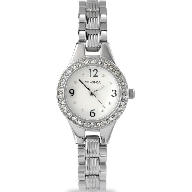 Silver-tone stainless steel case and bracelet. Fixed silver-tone bezel with crystal set. White dial with silver-tone hands and Arabic numeral-crystal hour markers. Arabic numeral markers appear at the 3, 6, 9 and 12 o'clock positions. Dial Type: Analog. Quartz movement. Scratch resistant mineral crystal. Pull / push crown. Solid case back. Round case shape, case size: 24 mm. Jewelry clasp. Functions: hour, minute, second. Casual watch style. Sekonda Quartz Crystal White Dial Ladies Watch 4297.72.