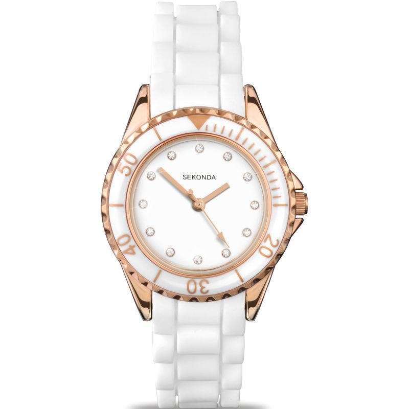 Rose gold PVD stainless steel case with a white silicone strap. White dial with rose gold-tone hands and crystal hour markers. Dial Type: Analog. Quartz movement. Scratch resistant mineral crystal. Solid case back. Round case shape, case size: 33 mm. Functions: hour, minute, second. Casual watch style. Watch label: Japan Movt. Sekonda Quartz Crystal White Dial Ladies Watch 4742.83.