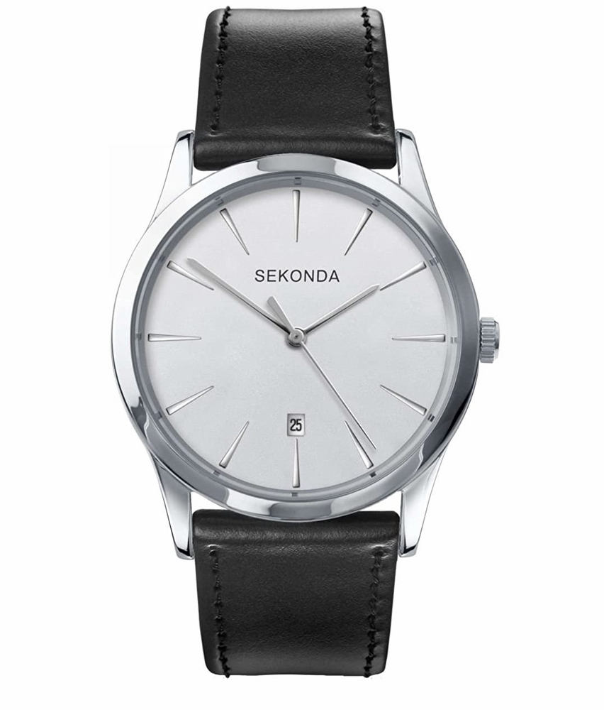 Silver-tone stainless steel case with a black leather strap. Silver dial with silver-tone hands and index hour markers. Dial Type: Analog. Date display above the 6 o'clock position. Quartz movement. Scratch resistant mineral crystal. Pull / push crown. Solid case back. Round case shape, case size: 40 mm, case thickness: 10 mm. Band width: 20 mm. Buckle clasp. Functions: date, hour, minute, second. Casual watch style. Sekonda Quartz Silver Dial Mens Watch 3531.83.