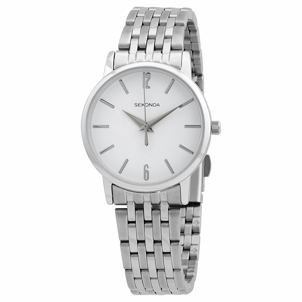 Stainless steel case with a stainless steel bracelet. Fixed stainless steel bezel. White dial with silver-tone hands and index hour markers. Arabic numerals appears at the 6 and 12 o'clock positions. Dial Type: Analog. Quartz movement. Scratch resistant mineral crystal. Pull / push crown. Solid case back. Round case shape. Fold over clasp with a push button release. Water resistant at 50 meters / 165 feet. Functions: hour, minute, second. Casual watch style. Watch label: Japan Movt. Sekonda Quartz White Dial Ladies Watch 2333.84.