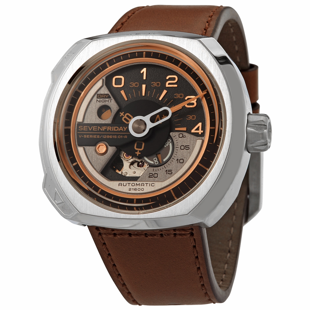 Silver-tone stainless steel case with a brown leather strap. Fixed silver-tone stainless steel bezel. Transparent dial with index-Arabic numeral hour markers. Minute markers around the outer rim. Dial Type: Analog. Two sub-dials displaying: 60 second and 24 hour. Miyota Caliber 82S7 Automatic movement, containing 21 Jewels, bitting at 21600 vph, and has a power reserve of approximately 40 hours. Scratch resistant mineral crystal. Pull / push crown. Transparent see through case back. Square case shape, case size: 44.3 mm. Tang clasp. Water resistant at 30 meters / 100 feet. Functions: GMT, second time zone, hour, minute, small second, day/night indicator. Additional Info: fast strap changer equipped. Sport watch style. Watch label: Japan Movt. SevenFriday Automatic Mens Watch V2/01.