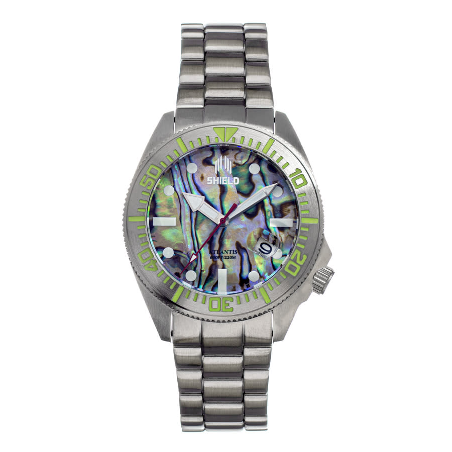 Silver-tone stainless steel case and bracelet. Uni-directional rotating silver-tone stainless steel bezel. Multi-color dial with silver-tone arrow-shaped hands and index hour markers. Dial Type: Analog. Luminescent hands and markers. Magnified date display at the 4 o'clock position. Automatic movement. Scratch resistant mineral crystal. Screw down crown. Transparent case back. Round case shape, case size: 44 mm, case thickness: 11 mm. Band width: 22 mm, band length: 9 inches. Fold over with double push button release clasp. Water resistant at 200 meters / 660 feet. Functions: date, hour, minute, second. Atlantis Series. Casual watch style. Watch label: Japan Movt. Shield Atlantis Automatic Silver Dial Mens Watch SLDSH108-1.