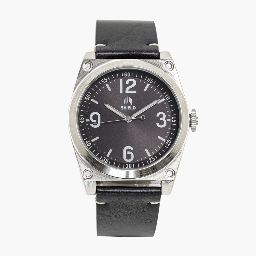 Silver-tone alloy case with a black leather strap. Fixed silver-tone alloy bezel. Black dial with silver-tone pencil-style shape hands and Arabic & index hour markers. Minute scale around the inner rim. Dial Type: Analog. Quartz movement. Scratch resistant mineral crystal. Pull / push crown. Solid case back. Round case shape, case size: 40 mm, case thickness: 7 mm. Band width: 22 mm, band length: 9.44 inches. Buckle clasp. Water resistant at 50 meters / 165 feet. Functions: hour, minute, second. Cavern Series. Casual watch style. Shield Cavern Quartz Black Dial Mens Watch SLDSH110-1.