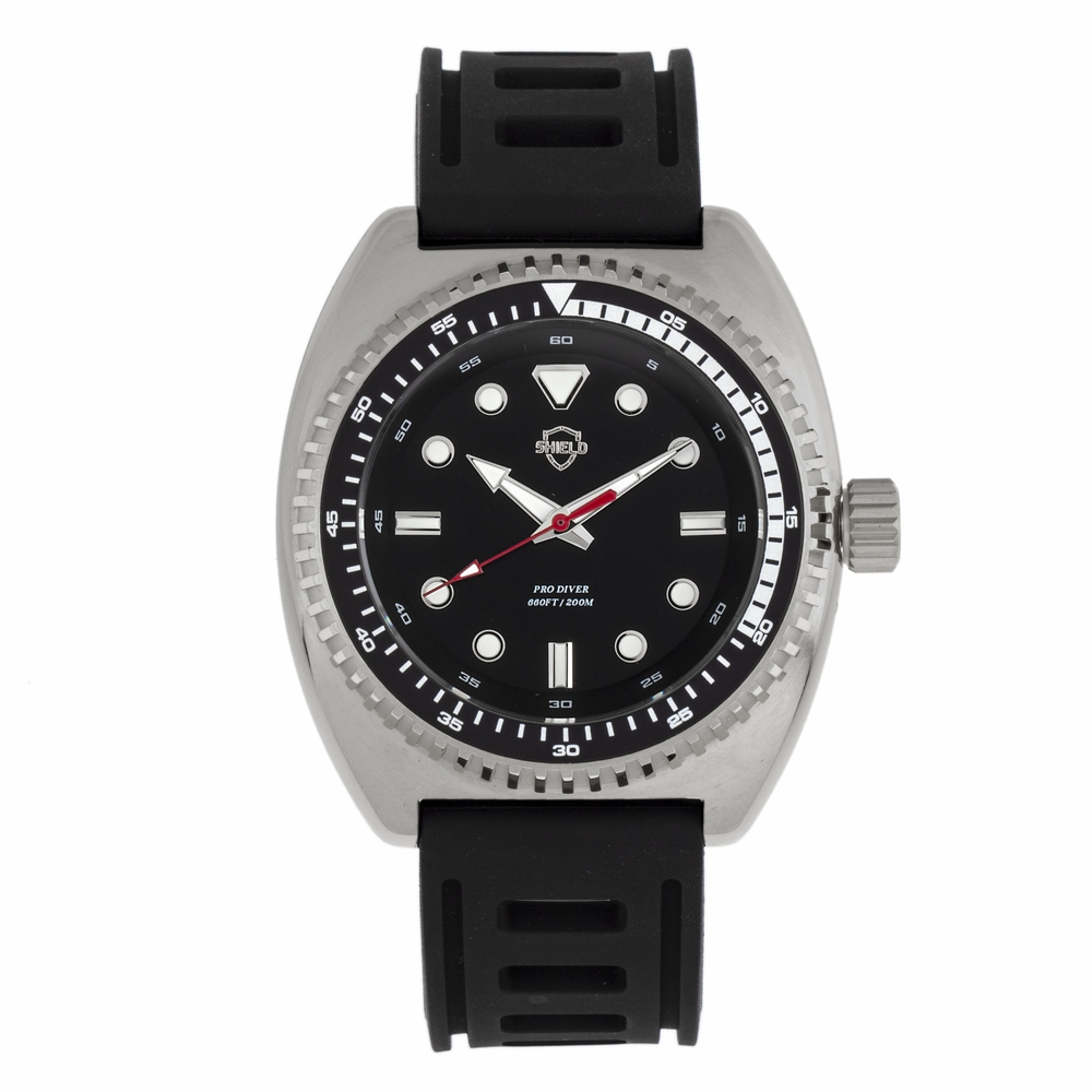 Silver-tone 316L surgical-quality stainless steel case with a black silicone strap. Uni-directional rotating black stainless steel bezel. Black dial with silver-tone hands and index hour markers. Dial Type: Analog. Luminescent hands and markers. Quartz movement. Scratch resistant mineral crystal. Screw down crown. Solid case back. Tonneau case shape, case size: 44 mm, case thickness: 15 mm. Band width: 22 mm. Buckle clasp. Water resistant at 200 meters / 660 feet. Functions: hour, minute, second. Dive watch style. Watch label: Japan Movt. Item Variations: SLDSH107-2. Shield Dreyer Quartz Black Dial Mens Watch SLDSH107-2.