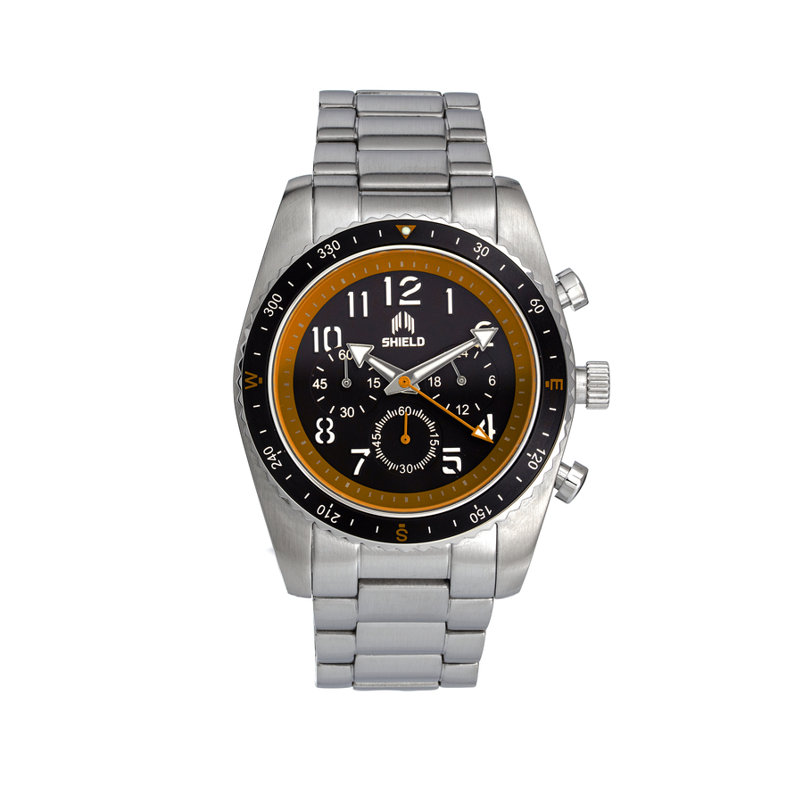 Stainless steel case with a stainless steel bracelet. Uni-directional rotating stainless steel bezel with a black ring showing 360 degree markings. Black dial with luminous silver-tone arrow-shaped hands and Arabic numeral hour markers. Minute markers around the outer rim. Dial Type: Analog. Luminescent hands and markers. Chronograph - three sub-dials displaying: 60 small second, 60 minute and 24 hour. Quartz movement. Scratch resistant mineral crystal. Screw down crown. Solid case back. Round case shape. Case size: 45 mm. Case thickness: 14 mm. Band width: 24 mm. Band length: 8.5 inches. Fold over with double push button release clasp. Water resistant at 200 meters / 660 feet. Functions: hour, minute, second, 24 hour. Exley Series. Casual watch style. Watch label: Swiss Made. Shield Exley Quartz Black Dial Stainless Steel Mens Watch SLDSH109-3.