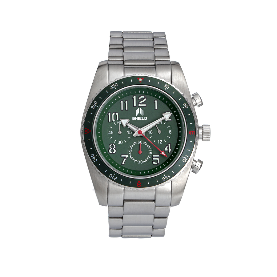 Stainless steel case with a stainless steel bracelet. Uni-directional rotating stainless steel bezel with a green ring showing 360 degree markings. Green dial with luminous silver-tone arrow-shaped hands and Arabic numeral hour markers. Minute markers around the outer rim. Dial Type: Analog. Luminescent hands and markers. Chronograph - three sub-dials displaying: 60 second, 60 minute and 24 hour. Quartz movement. Scratch resistant mineral crystal. Screw down crown. Solid case back. Round case shape. Case size: 45 mm. Case thickness: 14 mm. Band width: 24 mm. Band length: 8.5 inches. Fold over clasp with a double push button release. Water resistant at 200 meters / 660 feet. Functions: hour, minute, second, 24 hour. Exley Series. Casual watch style. Watch label: Japan Movt. Shield Exley Quartz Green Dial Stainless Steel Mens Watch SLDSH109-5.