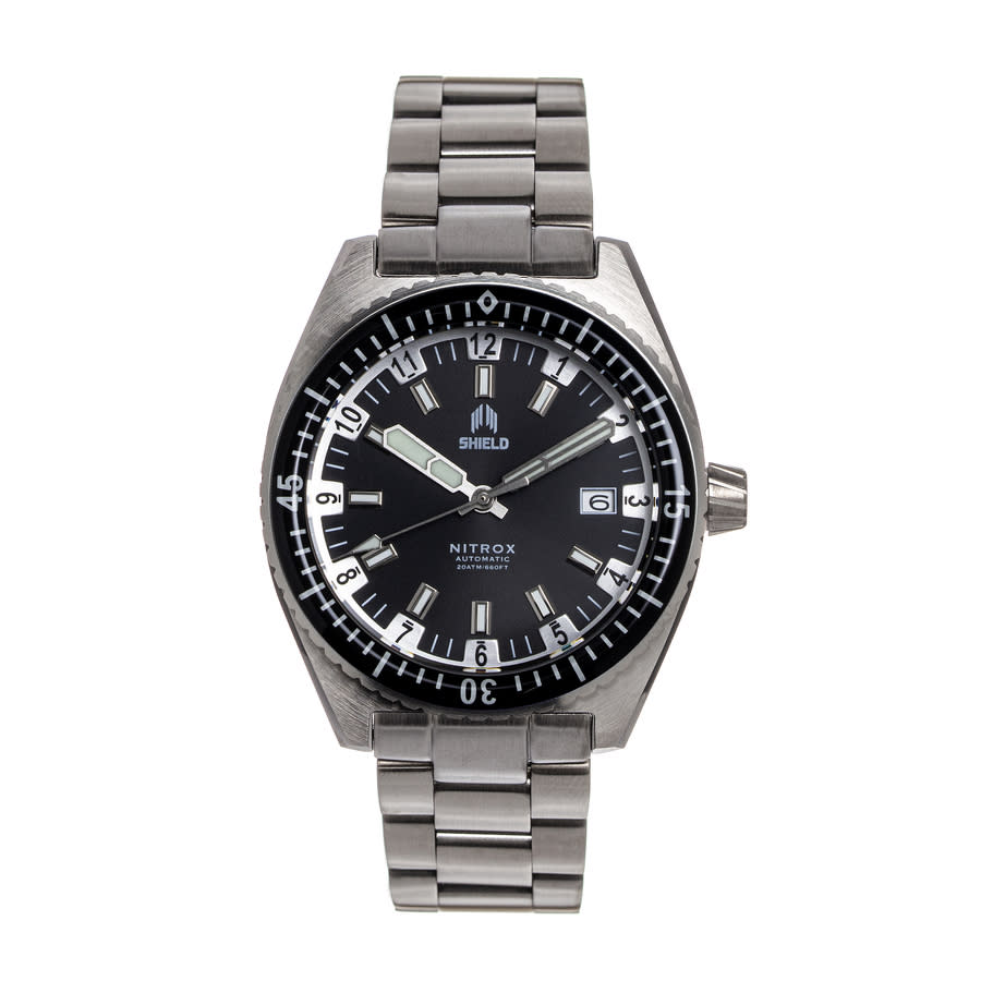 Band Color: Silver Stainless Steel; Band Width: 20mm near case; 18mm near clasp/buckle; Bezel Color: Black; Case: Silver + Circle-Shaped; Case Finish: Brushed + Stainless Steel; Case Thickness: 15mm; Case Width: 42mm; 45mm with Crown; Clasp / Buckle: Fold Over Push Button Deployment; Dial: Black + Analog; Hand Color: Silver; Movement: Japanese + Automatic; Time Zones: Single; Water Resistance: 20 ATM. Silver-tone stainless steel case and bracelet. Uni-directional rotating black stainless steel bezel. Black dial with silver-tone hands and Arabic numeral hour markers. Minute markers around the outer rim. Dial Type: Analog. Luminescent hands and markers. Date display at the 3 o'clock position. Automatic movement. Scratch resistant mineral crystal. Transparent case back. Round case shape, case size: 42 mm, case thickness: 15 mm. Band width: 20 mm, band length: 8.5 inches. Deployment with push button release clasp. Water resistant at 200 meters / 660 feet. Functions: date, hour, minute, second. Nitrox Series. Casual watch style. Watch label: Swiss Made. Shield NITROX Automatic Black Dial Mens Watch SLDSH114-1.