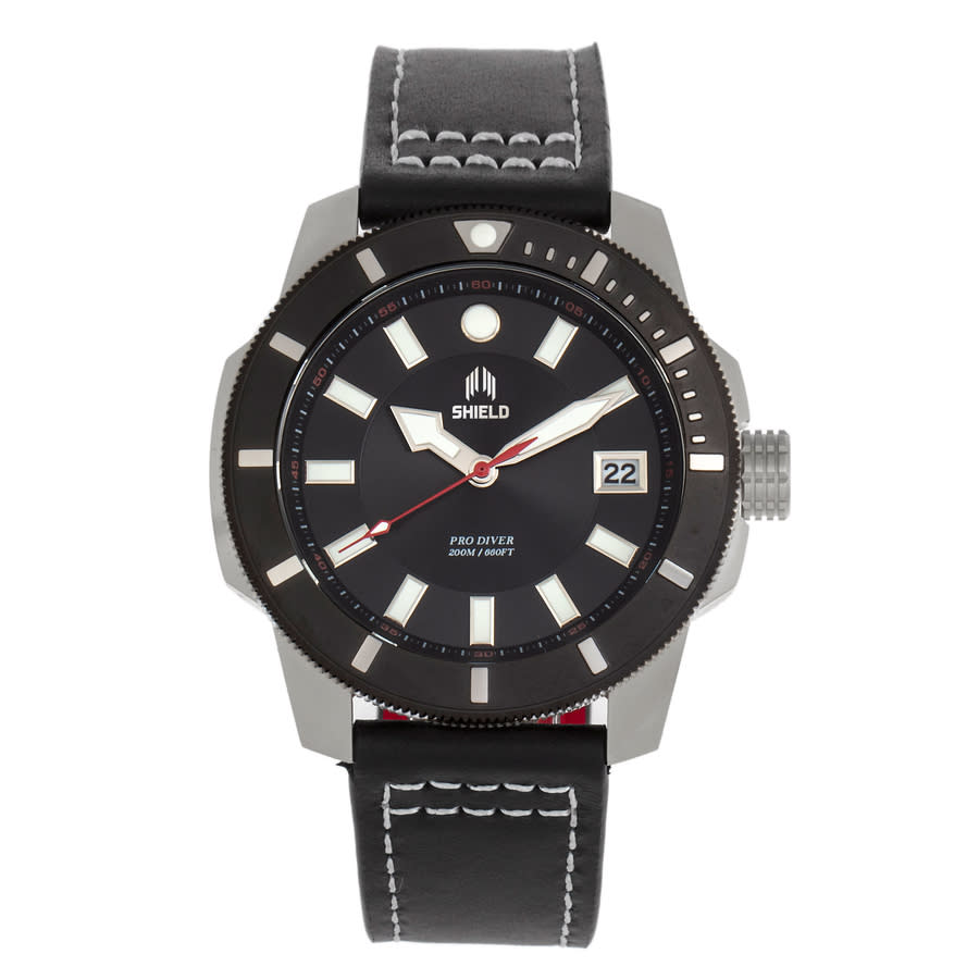 Band Color: Black Genuine Leather; Band Width: 22mm near case; 20mm near clasp/buckle; Bezel Color: Black; Case: Silver + Circle-Shaped; Case Finish: Brushed + Stainless Steel; Case Thickness: 16mm; Case Width: 48mm; 50mm with Crown; Clasp / Buckle: Strap Buckle; Dial: Black + Analog; Hand Color: Silver; Movement: Japanese + Quartz; Time Zones: Single; Water Resistance: 20 ATM.