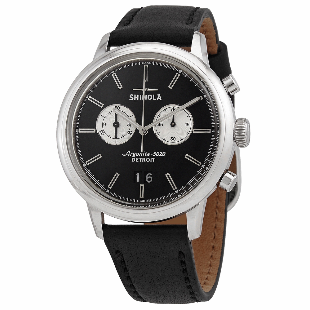 Stainless steel case with a black leather strap. Fixed stainless steel bezel. Black dial with silver-tone hands and index hour markers. Minute markers around the outer rim. Dial Type: Analog. Luminescent hands and markers. Date display above at the 6 o'clock position. Chronograph - two silver sub-dials displaying: 60 second and 30 minute. Quartz movement. Scratch resistant sapphire crystal. Screw down crown. Solid case back. Round case shape. Case size: 42 mm. Case thickness: 9 mm. Band width: 20 m mm. Tang clasp. Water resistant at 50 meters / 165 feet. Functions: chronograph, date, hour, minute, second. The Bedrock Series. Dress watch style. Shinola The Bedrock Chronograph Quartz Black Dial Mens Watch S0120089882.