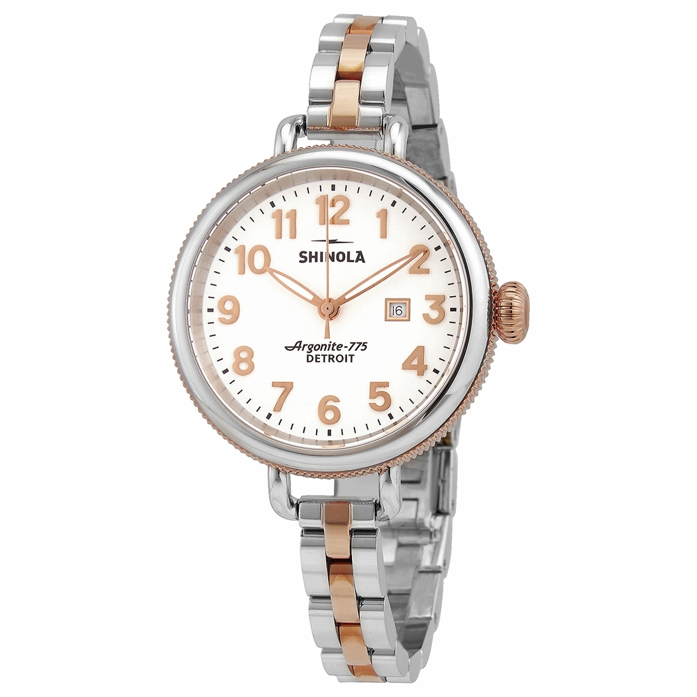 Rose gold PVD stainless steel case with a two-tone (silver-tone and rose gold PVD ) stainless steel bracelet. Fixed rose gold PVD bezel with a silver-tone ring. White dial with luminous rose gold-tone hands and Arabic numeral hour markers. Minute markers around the outer rim. Dial Type: Analog. Luminescent hands. Date display at the 3 o'clock position. Shinola calibre Argonite 775.2 quartz movement. Scratch resistant sapphire crystal. Screw down crown. Solid case back. Round case shape. Case size: 34 mm. Case thickness: 9 mm. Fold over clasp. Water resistant at 50 meters / 165 feet. Functions: date, hour, minute, second. The Birdy Series. Dress watch style. Shinola The Birdy Quartz White Dial Two-tone Ladies Watch S0101100.
