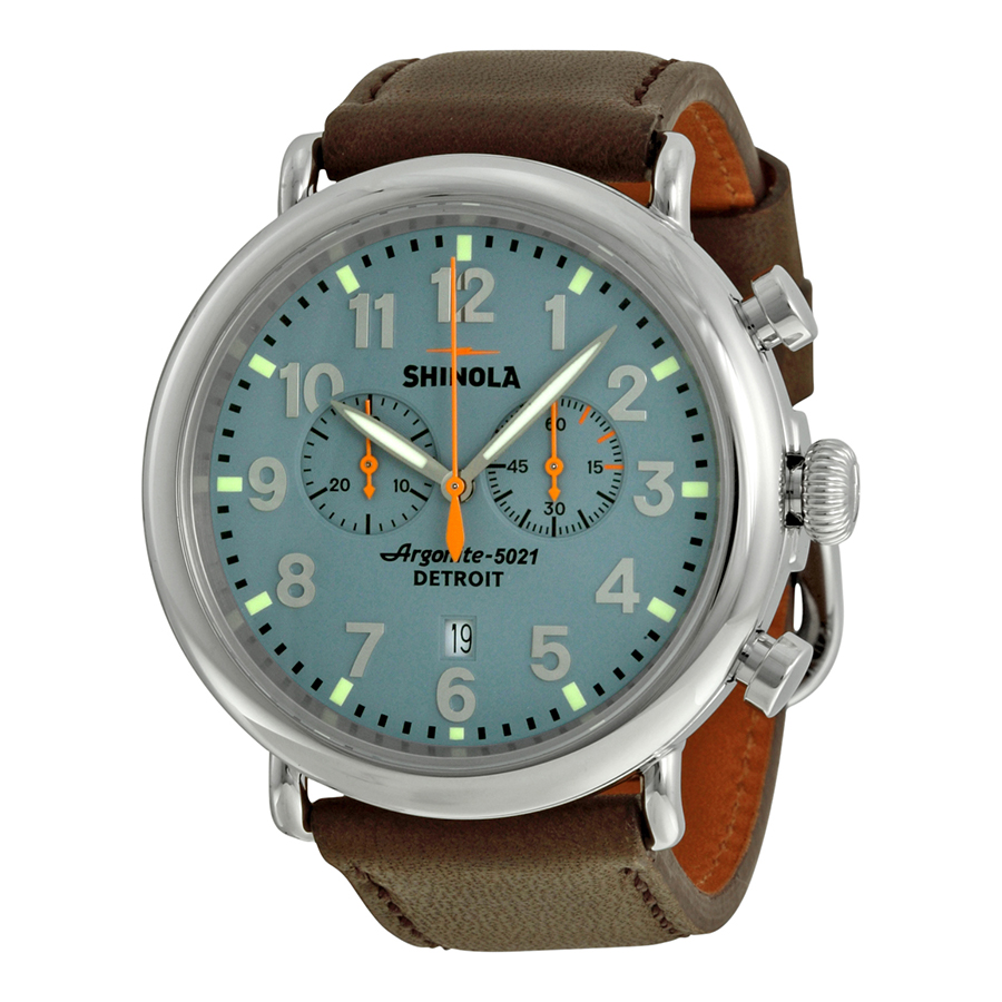 Stainless steel case with a deep brown leather strap. Fixed stainless steel bezel. Slate blue dial with luminous silver-toned hands and white Arabic numeral hour markers. Minute markers around the outer rim. Dial Type: Analog. Luminescent hands and markers. Date display above the 6 o'clock position. Chronograph - two sub-dials displaying: 60 second and 30 minute. Quartz movement. Scratch resistant sapphire crystal. Screw down crown. Solid case back. Case diameter: 47 mm. Case thickness: 12 mm. Round case shape. Band width: 22 mm. Tang clasp. Water resistant at 100 meters / 330 feet. Functions: chronograph, date, hour, minute, second. Casual watch style. Item Variations: S0110000167. Shinola The Runwell Chronograph Slate Blue Dial Deep Brown Leather Mens Watch 11000167.
