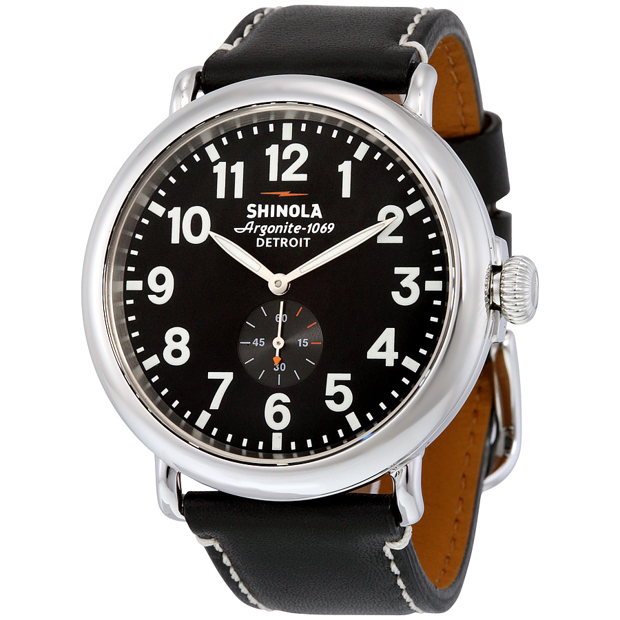 Stainless steel case with a black leather strap. Fixed stainless steel bezel. Black dial with luminous hands and Arabic numeral hour markers. Minute markers around the outer rim. Dial Type: Analog. Luminescent hands and markers. Small seconds sub-dial above the 6 o'clock position. Shinola caliber Argonite 1069 quartz movement. Scratch resistant sapphire crystal. Screw down crown. Solid case back. Round case shape. Case size: 47 mm. Case thickness: 11 mm. Band width: 24 mm. Tang clasp. Water resistant at 50 meters / 165 feet. Functions: hour, minute, small second. The Runwell Series. Casual watch style. Watch label: Detroit. Shinola The Runwell Black Dial Black Leather Mens Watch S0100012.