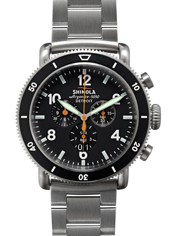 Grey titanium case with a grey titanium bracelet. Fixed grey titanium bezel with an inlaid black ring. Black dial with luminous silver-tone hands and alternating index and Arabic numeral hour markers. Minute markers around the outer rim. Dial Type: Analog. Luminescent hands and markers. Date display at the 6 o'clock position. Chronograph - three sub-dials displaying: 60 second, 30 minute and 1/10th of a second. Shinola calibre Argonite 5050 quartz movement. Scratch resistant sapphire crystal. Screw down crown. Solid case back. Round case shape, case size: 48 mm, case thickness: 14 mm. Band width: 24 mm. Deployment clasp with a push button release. Water resistant at 200 meters / 660 feet. Functions: chronograph, date, hour, minute, second. Black Blizzard Series. Sport watch style. Watch label: Detroit. Shinola Black Blizzard Chrono Black Dial Titanium Mens Watch S0100118.
