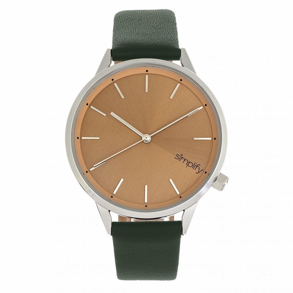 Silver-tone alloy case with a forest green leatherette strap. Fixed silver-tone alloy bezel. Camel dial with silver-tone hands and index hour markers. Dial Type: Analog. Quartz movement. Scratch resistant mineral crystal. Pull / push crown. Solid case back. Round case shape, case size: 42 mm, case thickness: 7 mm. Band width: 18 mm. Buckle clasp. Water resistant at 30 meters / 100 feet. Functions: hour, minute, second. Casual watch style. Watch label: Japan Movt. Simplify The 6700 Quartz Unisex Watch SIM6705.