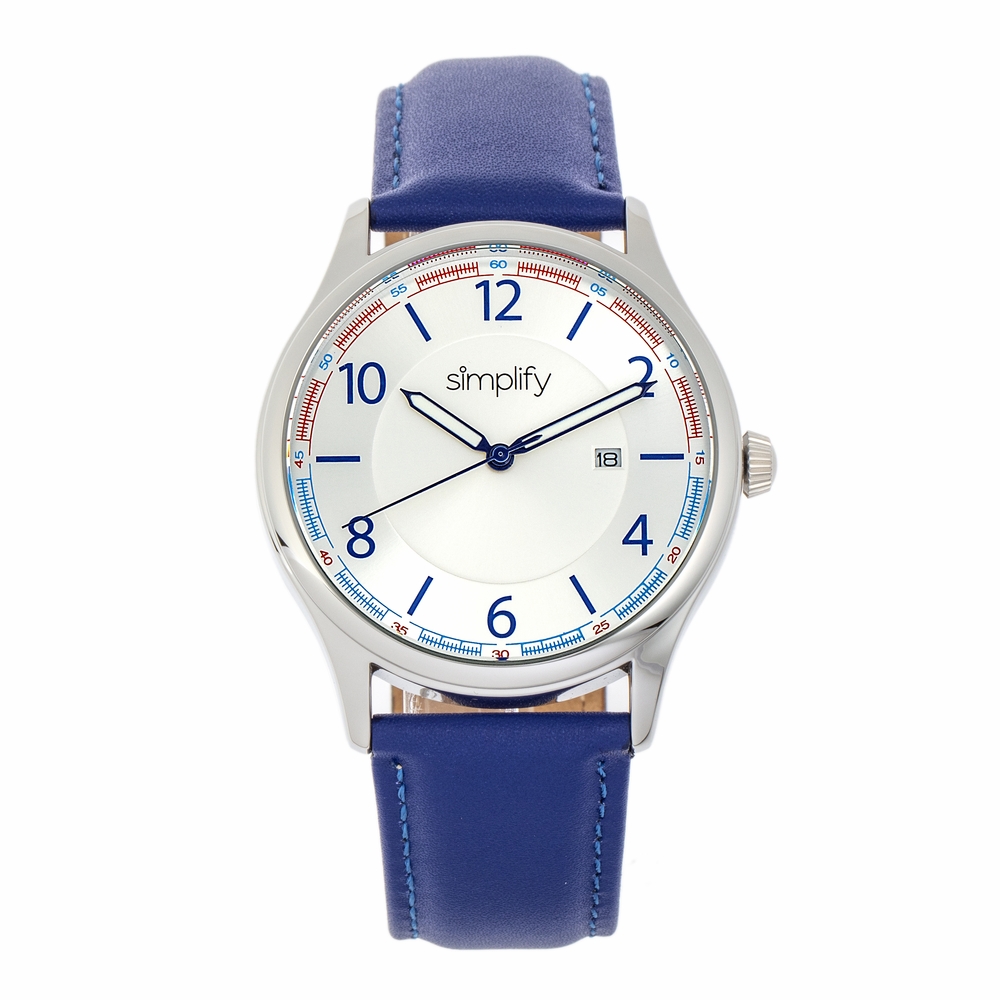 Silver-tone alloy case with a blue genuine leather strap. Fixed silver-tone alloy bezel. White dial with silver-tone hands and Arabic numeral and index hour markers. Minute markers around the outer rim. Dial Type: Analog. Luminescent hands and markers. Date display at the 3 o'clock position. Quartz movement. Scratch resistant mineral crystal. Pull / push crown. Solid case back. Round case shape, case size: 42 mm, case thickness: 10 mm. Band width: 22 mm. Buckle clasp. Water resistant at 30 meters / 100 feet. Functions: date, hour, minute, second. Casual watch style. Watch label: Japan Movt. Simplify The 6900 Quartz White Dial Unisex Watch SIM6903.