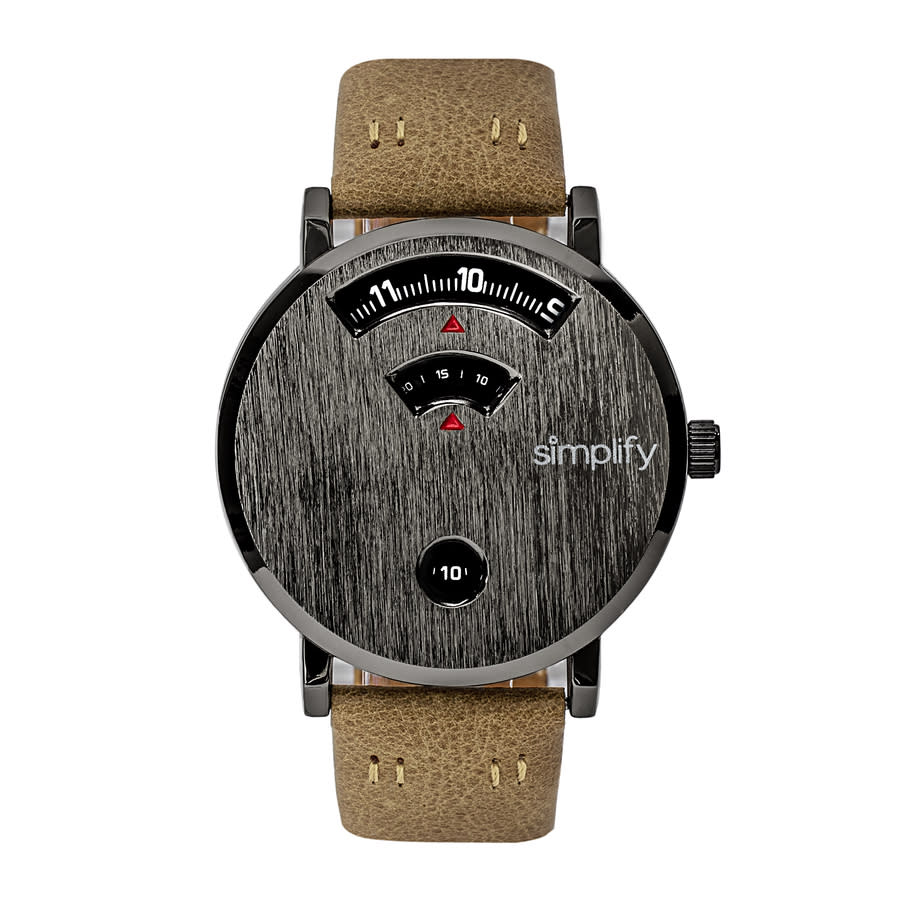 Band Color: Brown Genuine Leather; Band Width: 20mm near case; 18mm near clasp/buckle; Bezel Color: Gunmetal; Case: Gunmetal + Circle-Shaped; Case Finish: Brushed + Alloy; Case Thickness: 10mm; Case Width: 40mm; 43mm with Crown; Clasp / Buckle: Strap Buckle; Dial: Black + Analog; Hand Color: Red; Movement: Japanese + Quartz; Time Zones: Single; Water Resistance: 3 ATM.