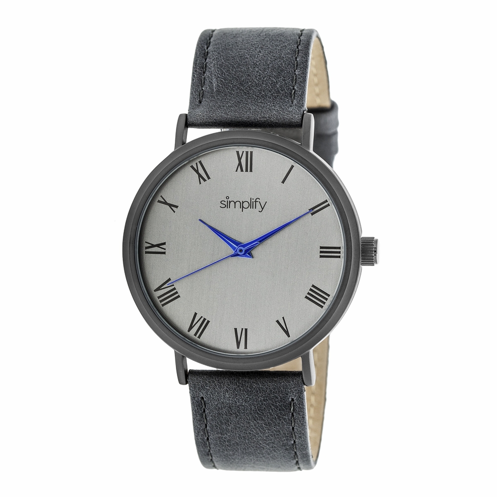 Black metal case with a charcoal leather strap. Fixed black bezel. Charcoal dial with blue hands and Roman numeral hour markers. Dial Type: Analog. Quartz movement. Scratch resistant mineral crystal. Solid case back. Round case shape, case size: 41 mm, case thickness: 9 mm. Band width: 20 mm. Buckle clasp. Water resistant at 30 meters / 100 feet. Functions: hour, minute, second. Casual watch style. Simplify The 2900 Watch SIM2906.