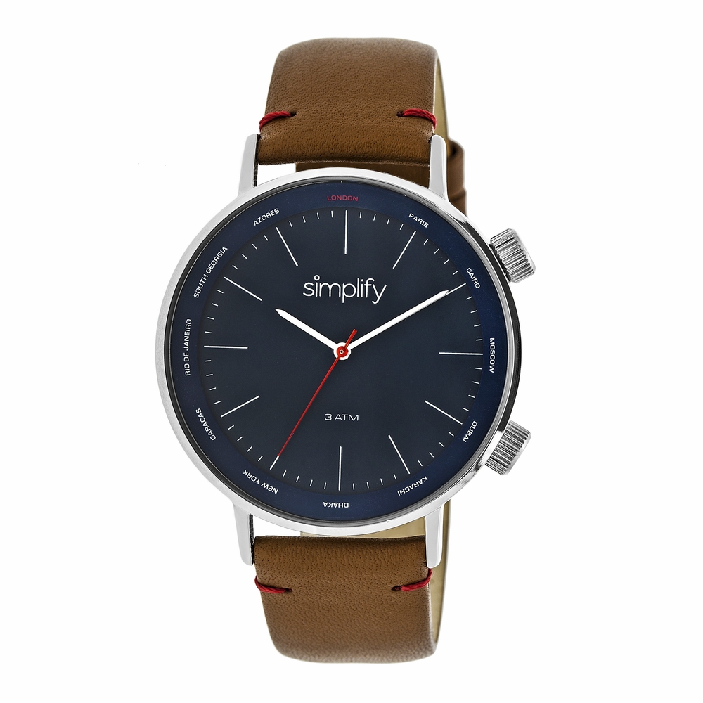 Silver-tone metal case with a brown leather strap. Fixed silver-tone bezel. Navy dial with silver-tone hands and index hour markers. Minute markers around the outer rim. Dial Type: Analog. Quartz movement. Scratch resistant mineral crystal. Solid case back. Round case shape, case size: 42 mm, case thickness: 9 mm. Band width: 20 mm. Buckle clasp. Water resistant at 30 meters / 100 feet. Functions: hour, minute, second. Casual watch style. Simplify The 3300 Watch SIM3303.