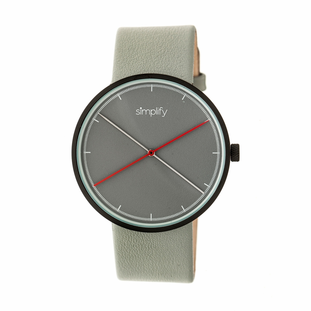 Black metal case with a grey leather strap. Fixed black bezel. Grey dial with index hour markers. Minute markers around the outer rim. Dial Type: Analog. Quartz movement. Scratch resistant mineral crystal. Round case shape, case size: 43 mm, case thickness: 8 mm. Band width: 22 mm. Buckle clasp. Water resistant at 30 meters / 100 feet. Functions: hour, minute. Casual watch style. Watch label: Japan Movt. Simplify The 4100 Grey Dial Watch SIM4102.