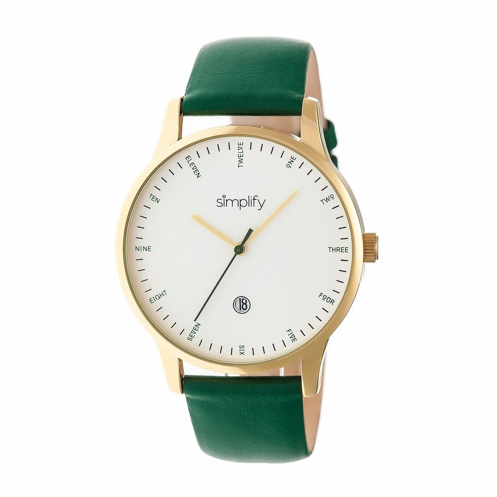 Gold-tone stainless steel case with a forest green leather strap. Fixed gold-tone bezel. White dial with gold-tone hands and index hour markers. Dial Type: Analog. Date display at the 6 o'clock position. Quartz movement. Scratch resistant mineral crystal. Round case shape, case size: 42 mm, case thickness: 9 mm. Band width: 20 mm. Buckle clasp. Water resistant at 30 meters / 100 feet. Functions: date, hour, minute, second. Casual watch style. Watch label: Japan Movt. Simplify The 4300 White Dial Watch SIM4305.
