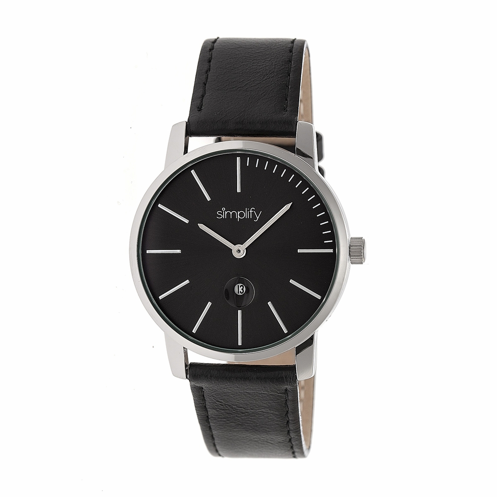 Silver-tone metal case with a black leather strap. Fixed silver-tone metal bezel. Black dial with silver-tone hands and index hour markers. Dial Type: Analog. Date display above the 6 o'clock position. Quartz movement. Scratch resistant mineral crystal. Pull / push crown. Solid case back. Round case shape. Case size: 40 mm. Case thickness: 9 mm. Band width: 20 mm. Tang clasp. Water resistant at 30 meters / 100 feet. Functions: date, hour, minute, second. The 4700 Series. Casual watch style. Simplify The 4700 Black Dial Black Leather Watch SIM4702.