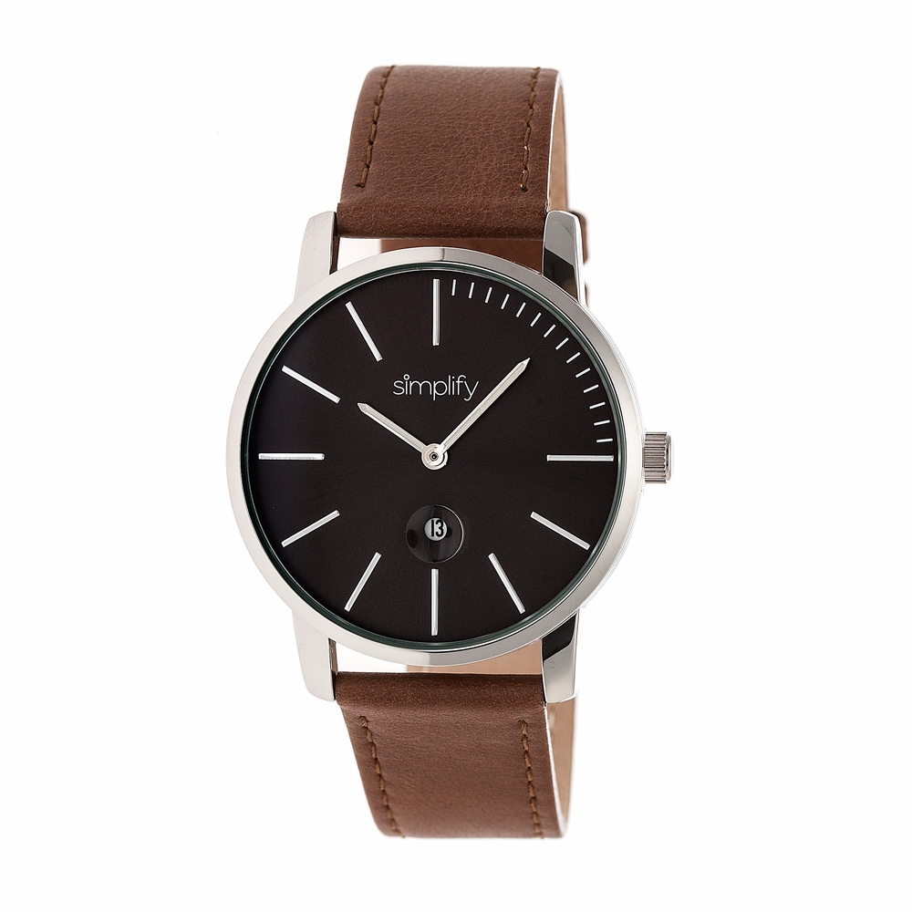 Silver-tone metal case with a brown leather strap. Fixed silver-tone metal bezel. Black dial with silver-tone hands and index hour markers. Dial Type: Analog. Date display above the 6 o'clock position. Quartz movement. Scratch resistant mineral crystal. Solid case back. Round case shape. Case size: 40 mm. Case thickness: 9 mm. Band width: 20 mm. Tang clasp. Water resistant at 30 meters / 100 feet. Functions: date, hour, minute, second. The 4700 Series. Casual watch style. Simplify The 4700 Black Dial Brown Leather Watch SIM4703.