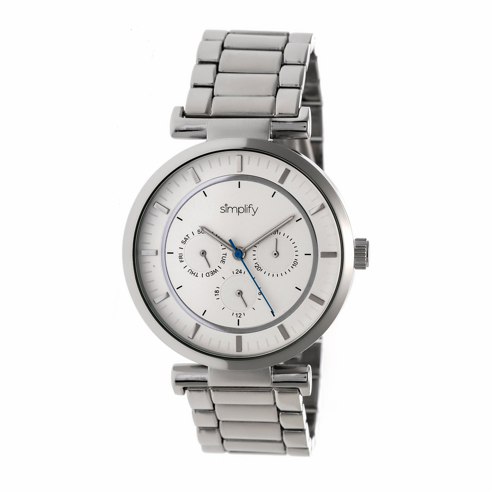 Silver-tone metal case with a silver-tone metal bracelet. Fixed silver-tone bezel. Silver-tone dial with silver-tone hands and index hour markers. Minute markers around the outer rim. Dial Type: Analog. Date display at the 3 o'clock position. Three - date, day, 24 hour subdials. Quartz movement. Scratch resistant mineral crystal. Round case shape, case size: 44 mm, case thickness: 9 mm. Band width: 22 mm. Push button deployment clasp. Water resistant at 30 meters / 100 feet. Functions: date, day, GMT, second time zone, hour, minute, second. Casual watch style. Watch label: Japan Movt. Simplify The 4800 Silver Dial Watch SIM4801.