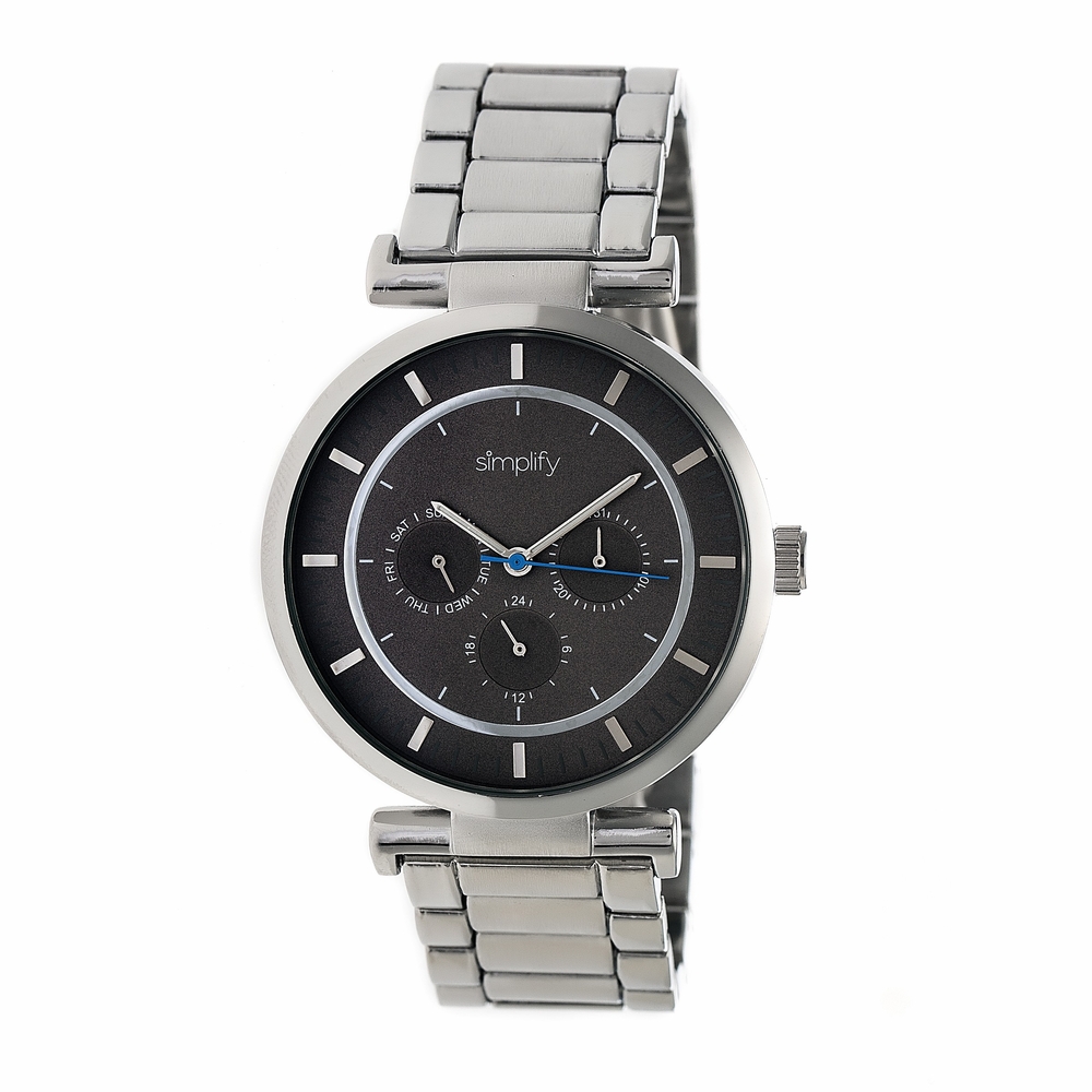Silver-tone metal case with a silver-tone metal bracelet. Silver-tone bezel. Black dial with silver-tone hands and index hour markers. Minute markers around the outer rim. Dial Type: Analog. Date display at the 3 o'clock position. Three - date, day, 24 hour subdials. Quartz movement. Scratch resistant mineral crystal. Round case shape, case size: 44 mm, case thickness: 9 mm. Band width: 22 mm. Push button deployment clasp. Water resistant at 30 meters / 100 feet. Functions: date, day, GMT, second time zone, hour, minute, second. Casual watch style. Watch label: Japan Movt. Simplify The 4800 Watch SIM4802.