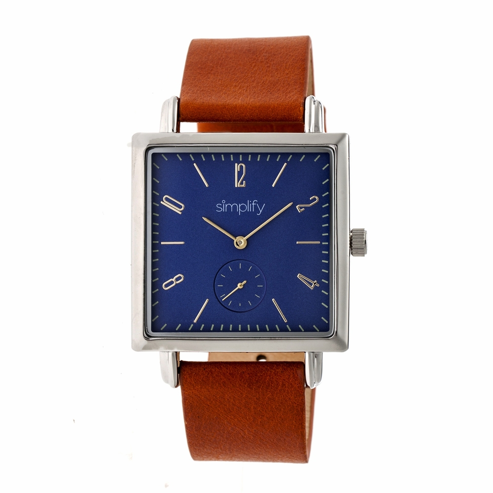 Silver-tone metal case with a brown leather strap. Fixed silver-tone bezel. Navy dial with gold-tone hands and Arabic numeral hour markers. Minute markers around the outer rim. Dial Type: Analog. One - 60 second subdial. Quartz movement. Scratch resistant mineral crystal. Solid case back. Square case shape, case size: 38 mm, case thickness: 10 mm. Band width: 22 mm. Buckle clasp. Water resistant at 30 meters / 100 feet. Functions: hour, minute, second. Casual watch style. Simplify The 5000 Watch SIM5004.