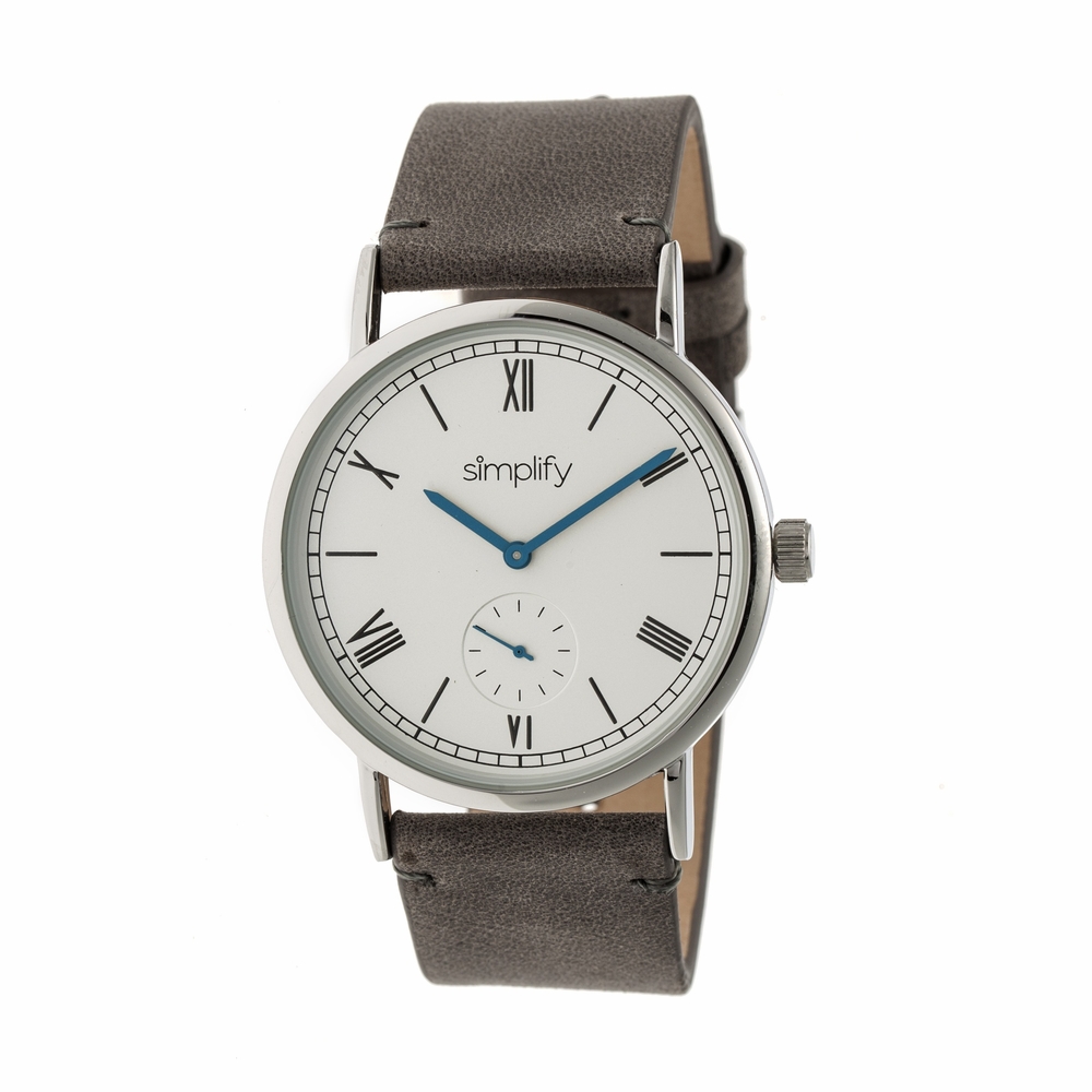 Silver-tone stainless steel case with a charcoal leather strap. Fixed silver-tone bezel. Silver-tone dial with blue hands and Roman numeral hour markers. Minute markers around the outer rim. Dial Type: Analog. Quartz movement. Scratch resistant mineral crystal. Solid case back. Round case shape, case size: 40 mm, case thickness: 9 mm. Band width: 22 mm. Buckle clasp. Water resistant at 30 meters / 100 feet. Functions: hour, minute, second. Casual watch style. Watch label: Japan Movt. Simplify The 5100 Silver Dial Watch SIM5103.