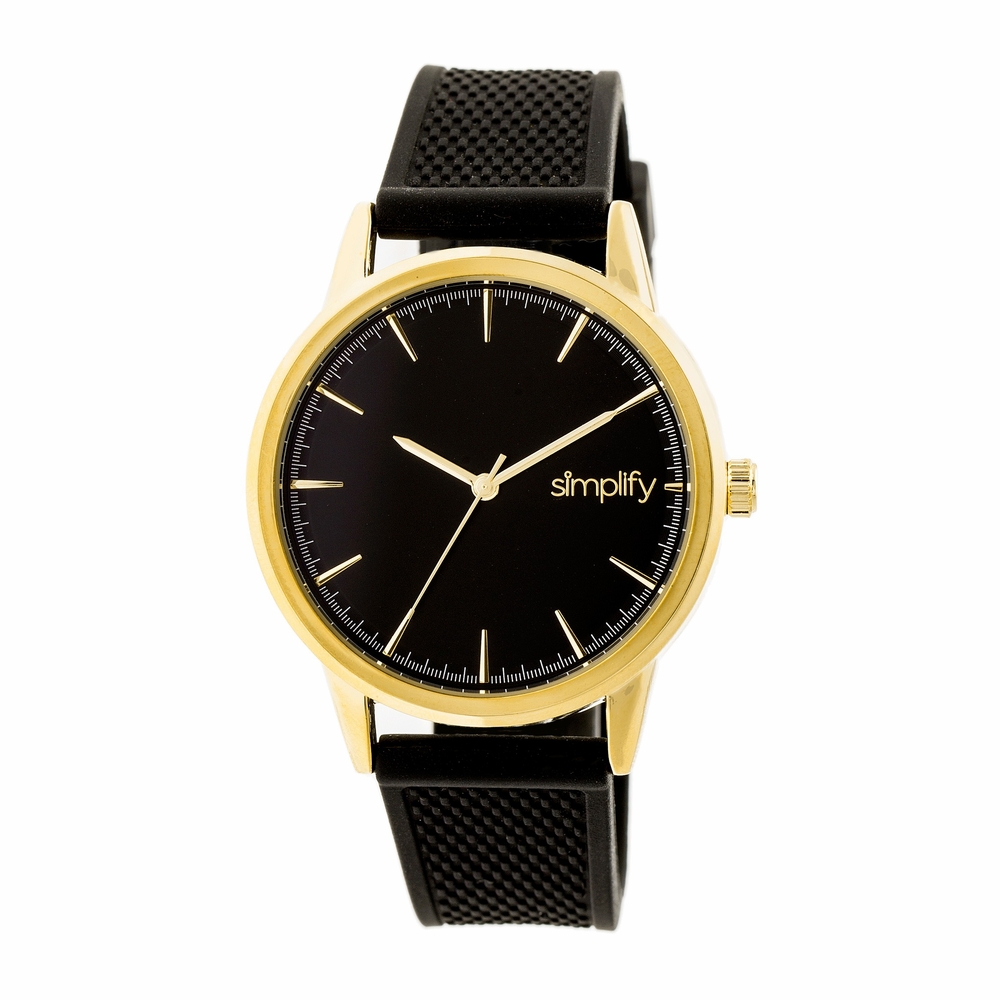 Gold-tone metal case with a black silicone strap. Fixed gold-tone bezel. Black dial with gold-tone hands and index hour markers. Minute markers around the outer rim. Dial Type: Analog. Quartz movement. Scratch resistant mineral crystal. Round case shape, case size: 41 mm, case thickness: 9 mm. Band width: 20 mm. Buckle clasp. Water resistant at 30 meters / 100 feet. Functions: hour, minute, second. Casual watch style. Watch label: Japan Movt. Simplify The 5200 Black Dial Watch SIM5203.