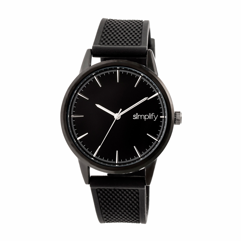 Black metal case with a black silicone strap. Fixed black bezel. Black dial with silver-tone hands and index hour markers. Minute markers around the outer rim. Dial Type: Analog. Quartz movement. Scratch resistant mineral crystal. Round case shape, case size: 41 mm, case thickness: 9 mm. Band width: 20 mm. Buckle clasp. Water resistant at 30 meters / 100 feet. Functions: hour, minute, second. Casual watch style. Watch label: Japan Movt. Simplify The 5200 Watch SIM5205. Black metal case with a black silicone strap. Fixed black bezel. Black dial with silver-tone hands and index hour markers. Minute markers around the outer rim. Dial Type: Analog. Quartz movement. Scratch resistant mineral crystal. Round case shape, case size: 41 mm, case thickness: 9 mm. Band width: 20 mm. Buckle clasp. Water resistant at 30 meters / 100 feet. Functions: hour, minute, second. Casual watch style. Watch label: Japan Movt. Simplify The 5200 Black Dial Watch SIM5205.