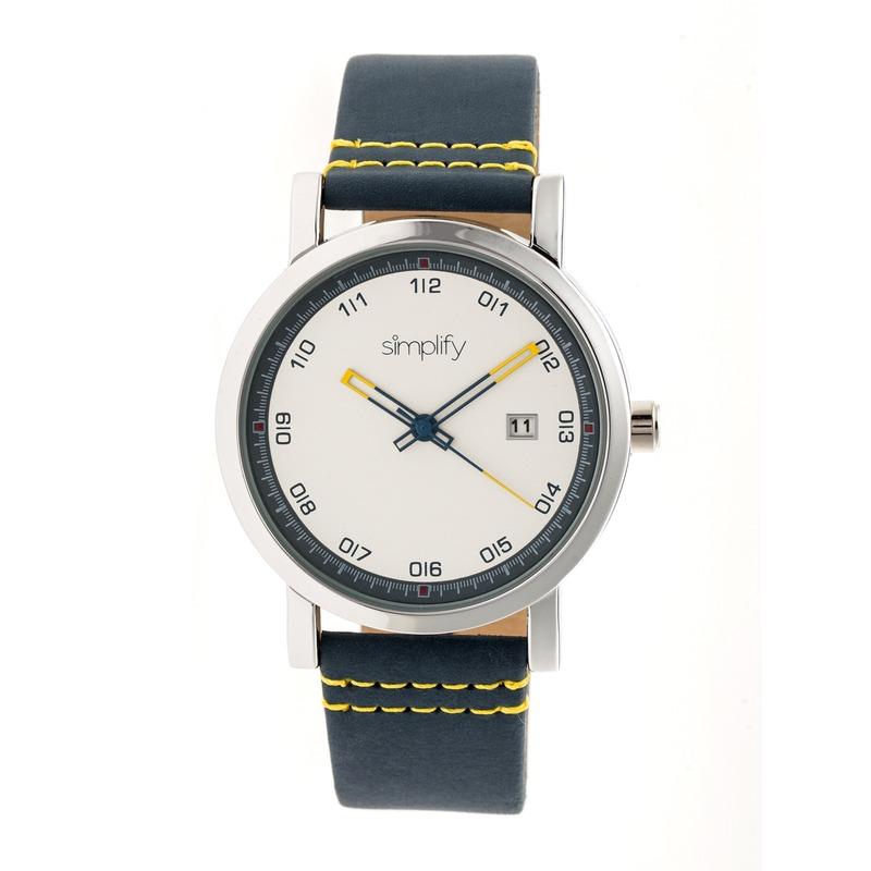 Silver-tone metal case with a blue leather strap. Fixed silver-tone bezel. Silver dial with Arabic numeral hour markers. Dial Type: Analog. Date display at the 3 o'clock position. Quartz movement. Scratch resistant mineral crystal. Round case shape, case size: 40 mm, case thickness: 10 mm. Band width: 20 mm. Buckle clasp. Water resistant at 30 meters / 100 feet. Functions: date, hour, minute, second. Casual watch style. Simplify The 5300 Silver Dial Watch SIM5301.