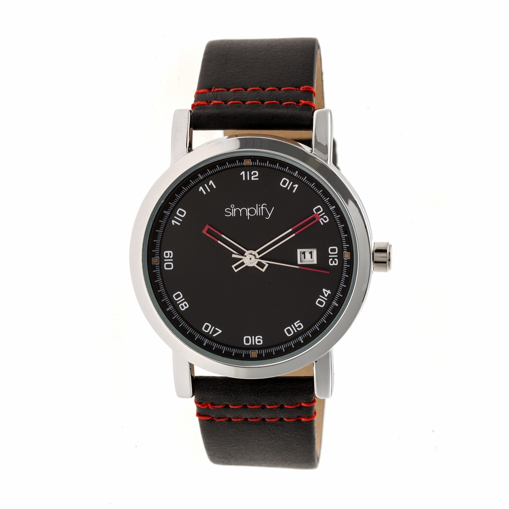Silver-tone metal case with a black leather strap. Fixed silver-tone bezel. Black dial with silver-tone and red hands and Arabic numeral hour markers. Minute markers around the outer rim. Dial Type: Analog. Date display at the 3 o'clock position. Quartz movement. Scratch resistant mineral crystal. Solid case back. Round case shape, case size: 40 mm, case thickness: 10 mm. Band width: 20 mm. Buckle clasp. Water resistant at 30 meters / 100 feet. Functions: date, hour, minute, second. Casual watch style. Simplify The 5300 Black Dial Watch SIM5302.