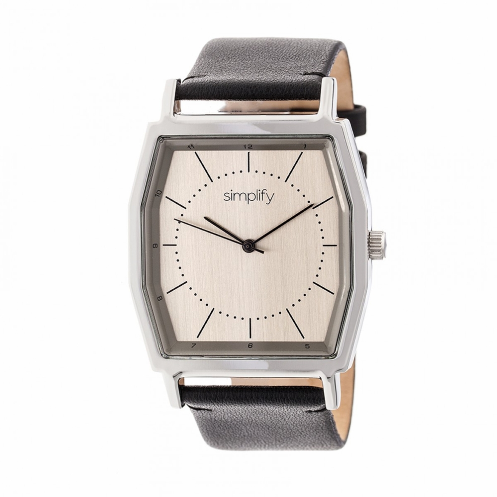Silver-tone stainless steel case with a black genuine leather strap. Fixed silver-tone bezel. Pewter dial with black hands and index hour markers. Minute scale around the inner rim. Dial Type: Analog. Quartz movement. Scratch resistant mineral crystal. Pull / push crown. Solid case back. Tonneau case shape, case size: 40 mm, case thickness: 9 mm. Band width: 24 mm. Buckle clasp. Water resistant at 50 meters / 165 feet. Functions: hour, minute, second. Casual watch style. Watch label: Japan Movt. Simplify The 5400 Watch SIM5403.