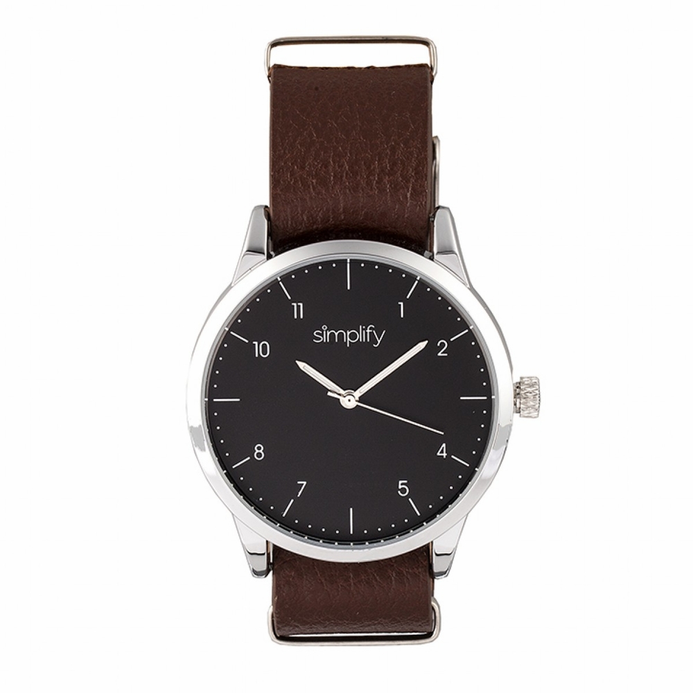 Silver-tone metal case with a brown genuine leather strap. Fixed silver-tone bezel. Black dial with silver-tone hands and Arabic numeral and index hour markers. Minute markers around the outer rim. Dial Type: Analog. Quartz movement. Scratch resistant mineral crystal. Pull / push crown. Solid case back. Round case shape, case size: 40 mm, case thickness: 10 mm. Band width: 20 mm. Buckle clasp. Water resistant at 50 meters / 165 feet. Functions: hour, minute, second. Casual watch style. Watch label: Japan Movt. Simplify The 5600 Black Dial Watch SIM5603.