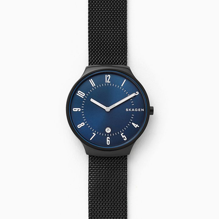 Black-plated stainless steel case with a black-plated stainless steel mesh bracelet. Fixed black-plated bezel. Blue dial with luminous silver-tone hands and Arabic numeral hour markers. Minute markers around an inner ring. Dial Type: Analog. Luminescent hands. Date display above the 6 o'clock position. Quartz movement. Scratch resistant mineral crystal. Pull / push crown. Solid case back. Round case shape, case size: 38 mm, case thickness: 6 mm. Band width: 18 mm. Fold over slip through clasp. Water resistant at 30 meters / 100 feet. Functions: date, hour, minute. Grenen Series. Casual watch style. Skagen Grenen Quartz Blue Dial Black-plated Mesh Mens Watch SKW6461.