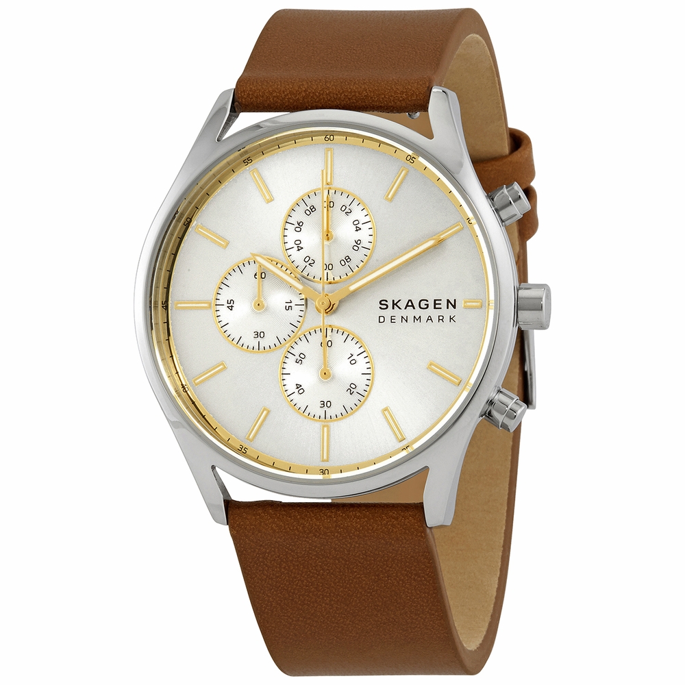 Stainless steel case with a brown leather strap. Fixed stainless steel bezel. Silver sunray dial with luminous hands and index hour markers. Minute markers around the outer rim. Dial Type: Analog. Luminescent hands. Chronograph - three sub-dials displaying: 60 second, 60 minute and 1/10th of a second. Quartz movement. Scratch resistant mineral crystal. Pull / push crown. Solid case back. Round case shape. Case size: 42 mm. Case thickness: 6 mm. Band width: 22 mm. Tang clasp. Water resistant at 50 meters / 165 feet. Functions: chronograph, hour, minute, second. Holst Series. Casual watch style. Skagen Holst Chronograph Quartz Silver Dial Mens Watch SKW6607.