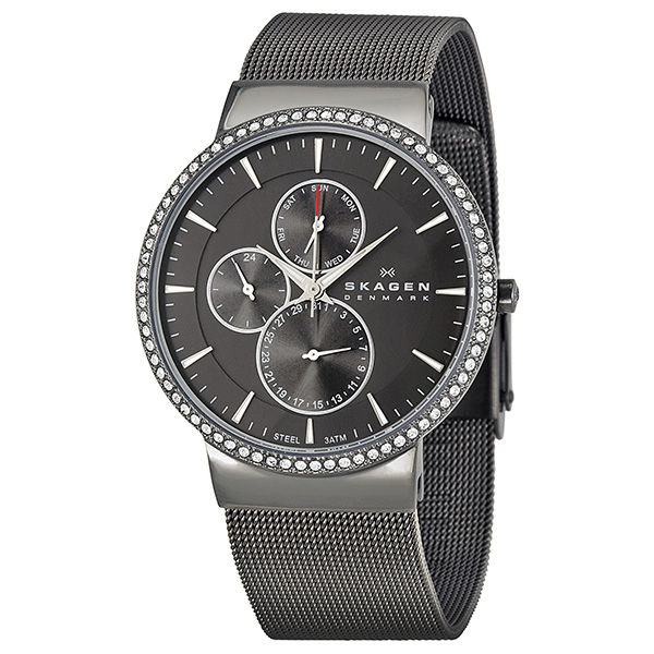 Gray (carbon coated) stainless steel case with a grey stainless steel mesh bracelet. Fixed bezel set with Swarovski crystals. Gray dial with silver-tone hands and index hour markers. Minute markers around the outer rim. Dial Type: Analog. Three multi-function sub-dials displaying: 24 hours, date and day of the week. Quartz movement. Scratch resistant mineral crystal. Solid case back. Case diameter: 37mm. Case thickness: 8 mm. Round case shape. Band width: 20 mm. Fold over clasp with safety release. Water resistant at 30 meters / 100 feet. Functions: date, day, 24 hour, hour, minute, second. Casual watch style. Skagen Multi-Function Grey Dial Crystal Bezel Ladies Watch 357XLMM