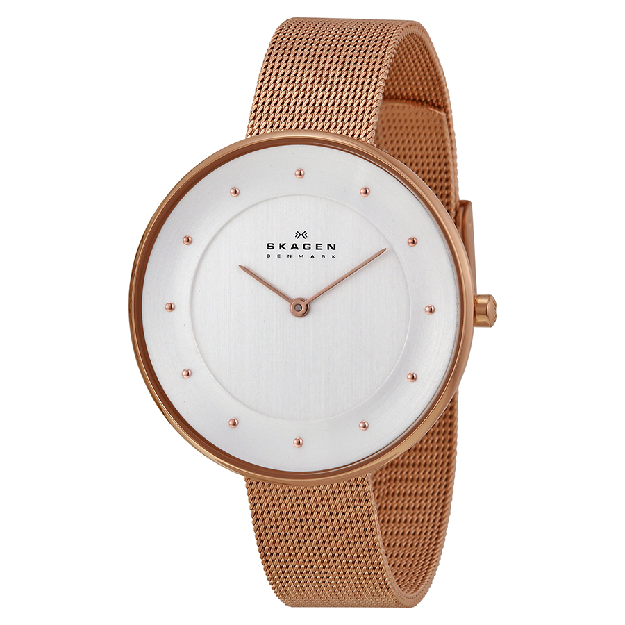 Rose gold-tone stainless steel case with a rose gold-tone stainless steel mesh bracelet. Fixed rose gold-tone bezel. Silver dial with rose gold-toned hands and dot hour markers. Dial Type: Analog. Quartz movement. Scratch resistant mineral crystal. Solid case back. Case diameter: 38 mm. Case thickness: 5.5 mm. Round case shape. Band width: 14 mm. Tang clasp. Water resistant at 30 meters / 100 feet. Functions: hour, minute. Additional Info: withstands rain and splashes of water, but not showering or submersion. Dress watch style. Skagen Gitte Silver Dial Rose Gold-Tone Stainless Steel Ladies Watch SKW2142.