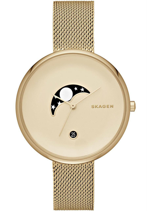 Gold-tone stainless steel case with a gold-tone stainless steel mesh bracelet. Fixed gold-tone bezel. Gold dial with gold-tone hands. Moonphase display near center dial. Dial Type: Analog. Date display above the 6 o'clock position. Quartz movement. Scratch resistant mineral crystal. Pull / push crown. Solid case back. Case diameter: 38 mm. Case thickness: 9 mm. Round case shape. Band width: 14 mm. Band length: 7 inches. Water resistant at 30 meters / 100 feet. Functions: date, hour, minute, second, moonphase. Casual watch style. Skagen Gitte Moonphase Gold Dial Gold-tone Mesh Ladies Watch SKW2373.