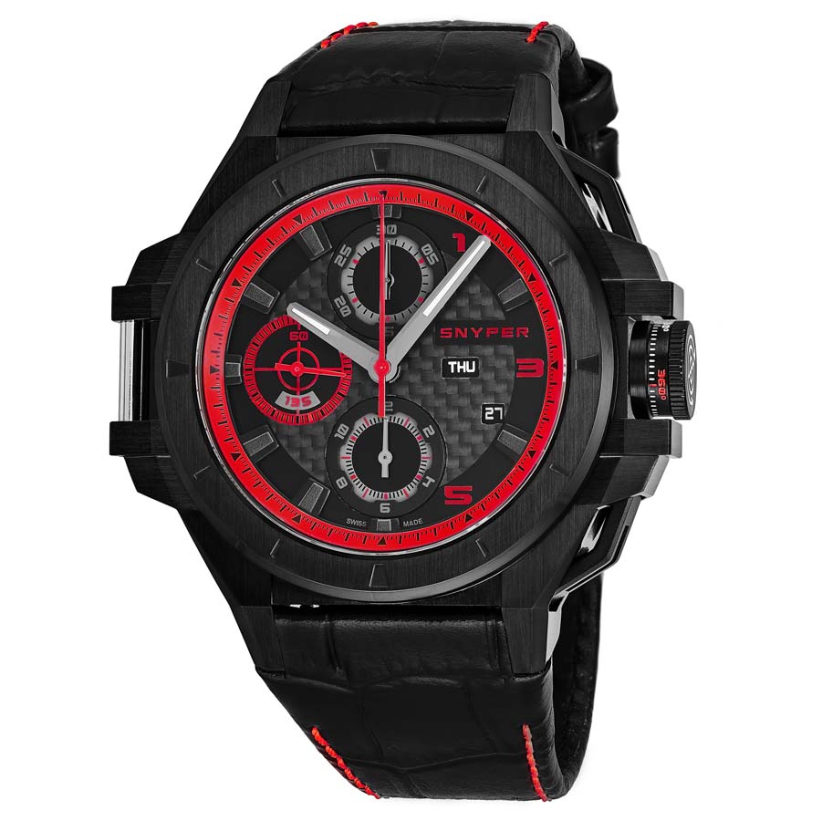 Black PVD brushed and polished stainless steel case with a black calf leather with alligator pattern strap. Fixed black stainless steel bezel. Blk chrnored dial with grey hands and index hour markers. Minute markers around the outer rim. Dial Type: Analog. Luminescent hands. Date display window at the 4 o'clock position and a day of the week display window at the 3 o'clock position. Chronograph - three sub-dials displaying: 60 second, 30 minute and 12 hour. Snyper Calibre F101 Automatic movement, based upon ETA 7750, containing 25 Jewels, bitting at 21600 vph, and has a power reserve of approximately 48 hours. Scratch resistant sapphire crystal. Screw down crown. Transparent case back. Round case shape, case size: 49 mm x 53 mm, case thickness: 14.7 mm. Deployment buckle clasp. Water resistant at 100 meters / 330 feet. Functions: chronograph, date, day of the week, hour, minute, second. Ironclad 513 Series. Sport watch style. Watch label: Swiss Made. Snyper IronClad 513 Chronograph Automatic Mens Watch 50.250.00.